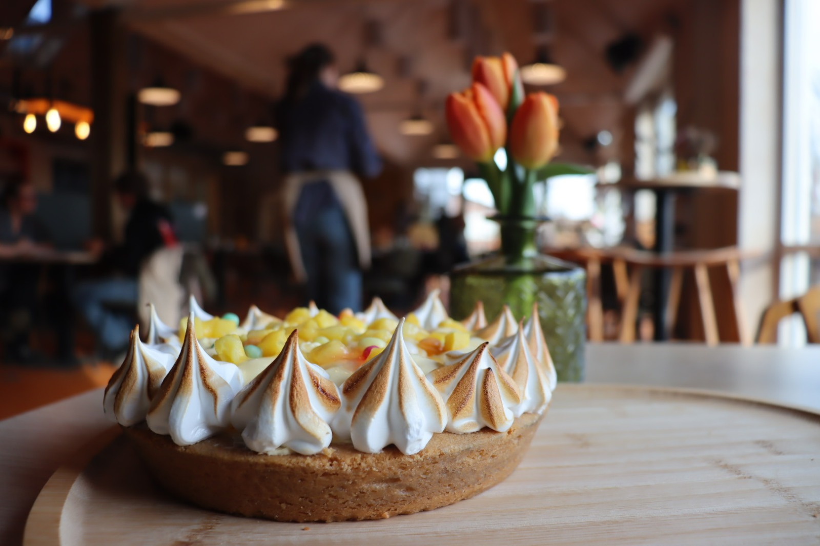 Een zachte taart met mango bavaroise op een krokante koekbodem.  Gevuld met zachte mango bavaroise en frisse stukjes mango. Afgewerkt met vrolijke Paas decoratie voor een feestelijke touch.