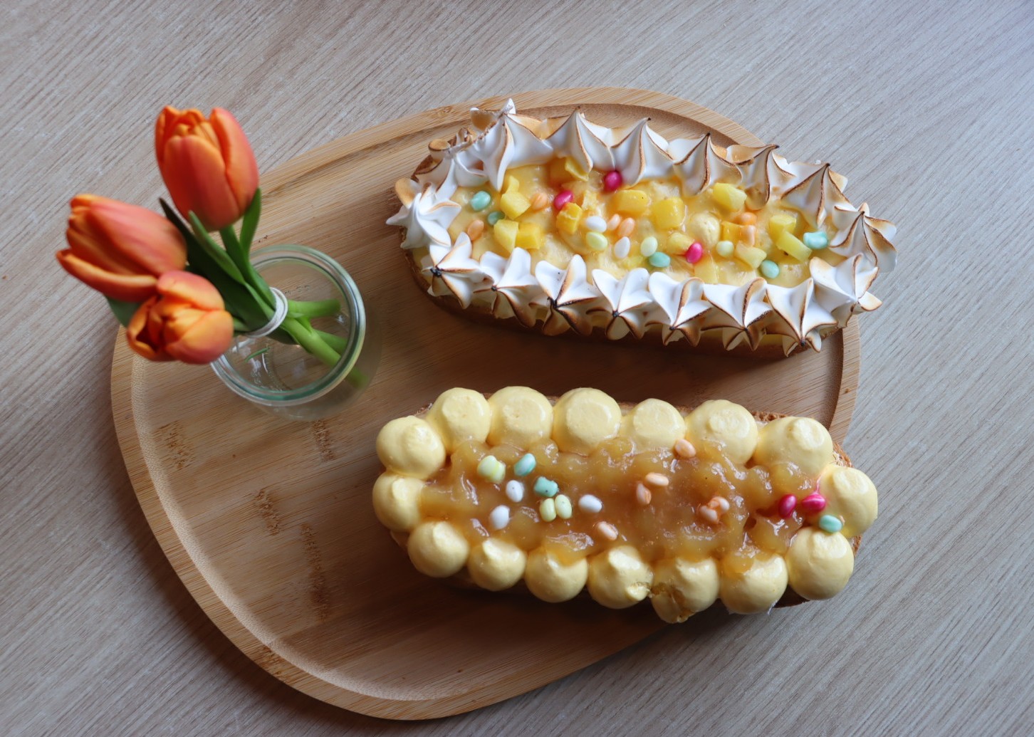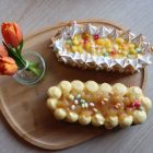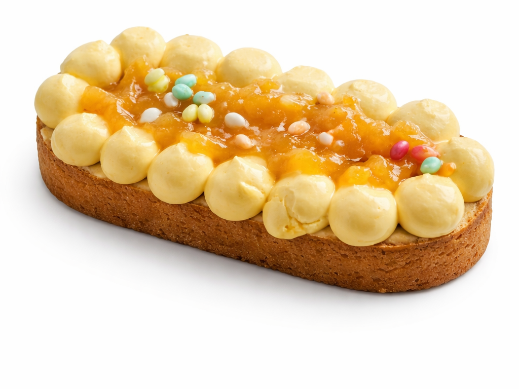 Onze mango bavaroise slof begint met een sloffenbodem van roomboter. Gevuld met zachte mango bavaroise en frisse stukjes mango. Afgewerkt met luchtige meringue en vrolijke paaseitjes voor een feestelijke touch.